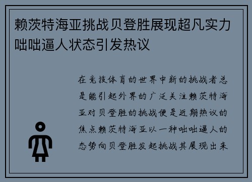 赖茨特海亚挑战贝登胜,不仅仅是一场比赛,更是一场关于勇气、实力与挑战的较量。他通过超凡的表现和咄咄逼人的状态,展示了自己不惧强敌的决心,也让观众和媒体看到了新一代选手的崛起。虽然挑战中有着巨大的风险,但正是这种勇于挑战的精神推动了整个竞技体育的发展。